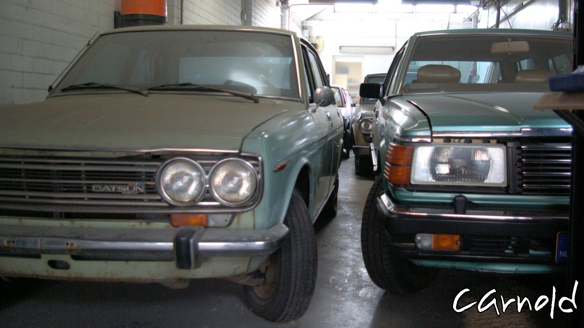 Vanuit de keuken heb ik al met een schuin oog zitten loeren wat er allemaal in de voormalige autoschade-werkplaats staan. Buiten staat een schade-Laurel die voor onderdelen wordt gebruikt, Hij heeft al interieur- en plaatdelen moeten afstaan, en zijn machtige zes-in-lijn diesel is bij de vorige eigenaar in België achtergebleven. Op een brug staat een onberispelijke Nissan Laurel, vanonder de brug loeren de vier guitige ogen van een Datsun 510 mijn kant op. Man, wat zou ik dat wagentje graag willen hebben! Maar er staat nog zoveel meer moois. Kijk en geniet:
