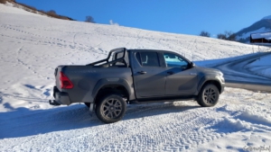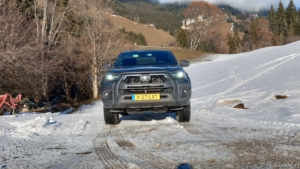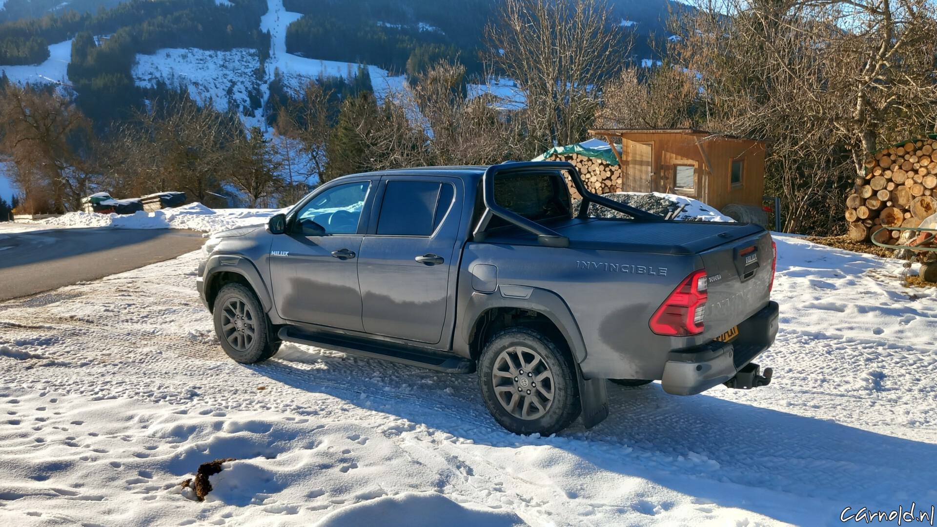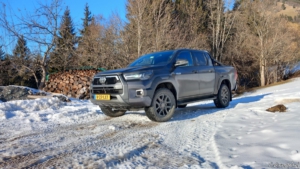 Het is de combinatie van de zitpositie, het immense motorkoppel en de zekerheid dat je overal aankomt die er voor zorgt dat de Hilux een onthaastauto is. De verbetermogelijkheden die ik zie, zijn ongetwijfeld verwerkt in de nieuwe generatie. Dat Toyota deze mild-hybride aandrijflijn een op een overhevelt naar de nieuweling is begrijpelijk, die laat de Hilux doen wat je er van verwacht. In Oostenrijk ben ik met mijn kameraad Georg een rondje gaan toeren over de lokale boswegen. Zelfs in het dichte bos op zo’n 1.200 meter ligt een best pak sneeuw en er is duidelijk in geen wegen gemotoriseerd verkeer geweest. De onverharde weg is in de zomermaanden al een avontuur, laat staan met decimeters sneeuw in de winter. Om een lang verhaal kort te maken: voor de Hilux voelt het als een ritje naar de supermarkt.