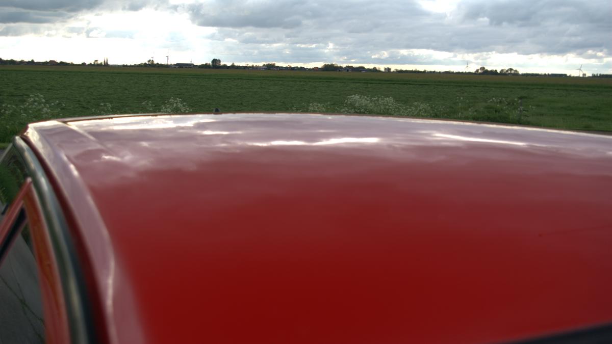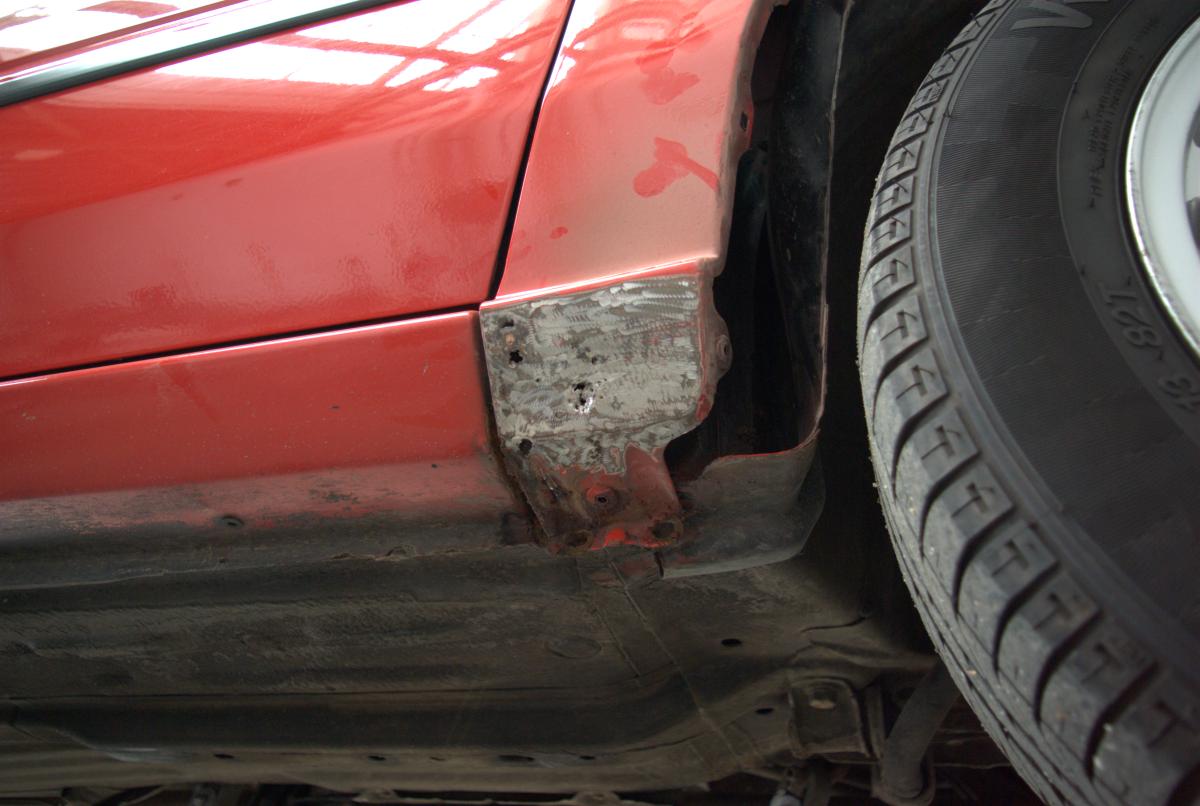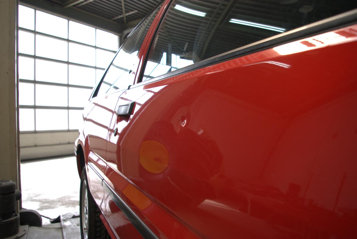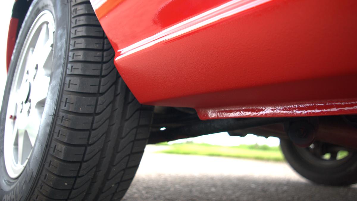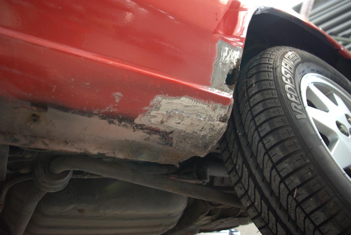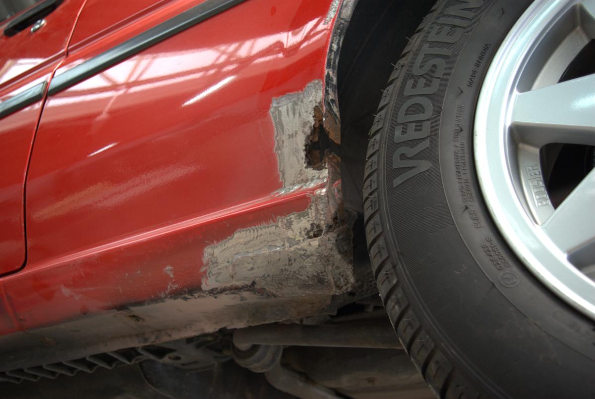 De dorpels waren ook niet supergaaf meer. Bij de achterwielen zat aan weerszijden een gat, en op de aanzetting halverwege de dorpels begon de roestduivel (zij het na 24 jaar pas) te vreten. Naast deze roestproblemen was de lak op plaatsen ook niet mooi meer. De voorbumper is ooit vervangen door een standaardbumper die voorzien is van mistlampgaten en een rood kleurtje. De blanke lak begon af te bladderen en dat ging van kwaad tot erger. De grootste doornen in Carnold’s oog waren de deukjes in de rechter zijkant. Oude parkeerschades die des te meer opvielen omdat ze midden in het strakke plaatwerk zaten.