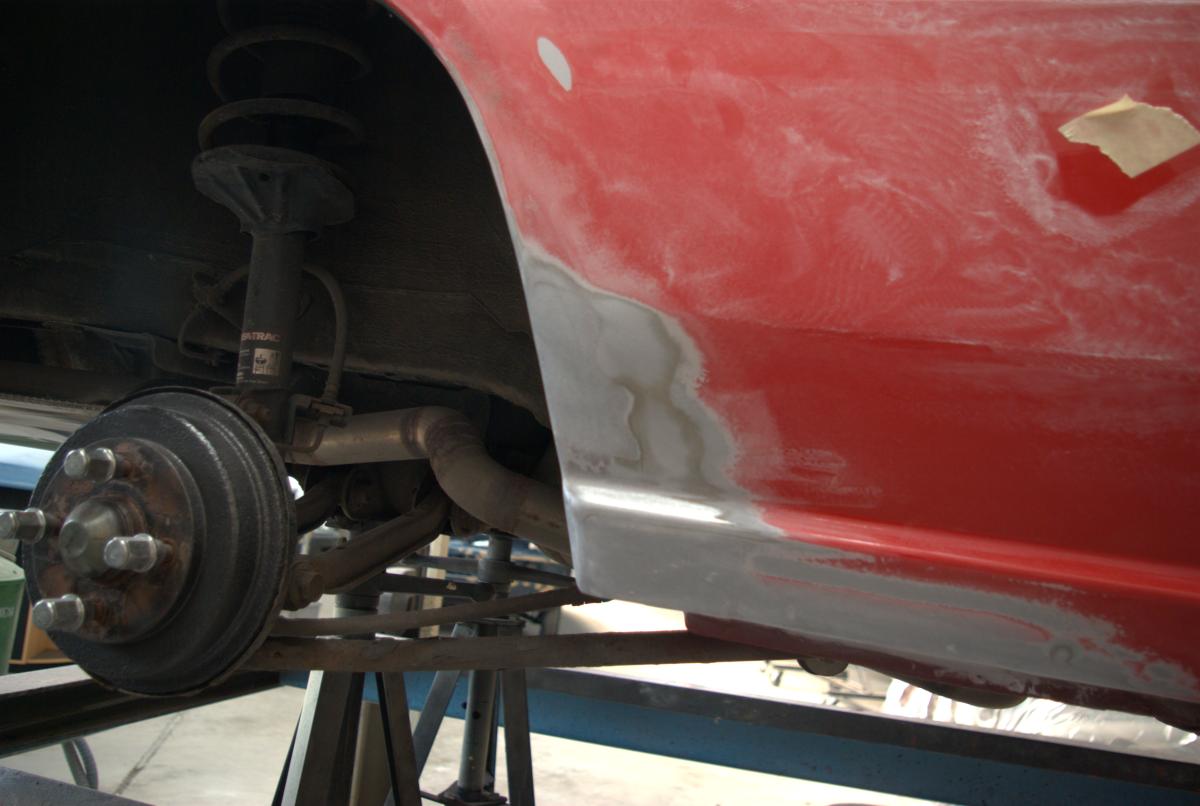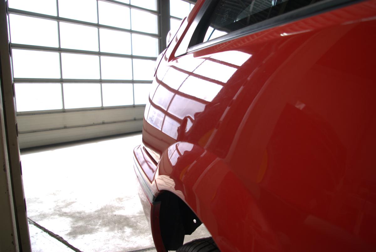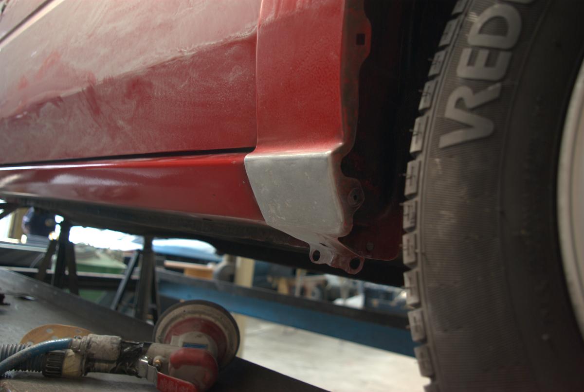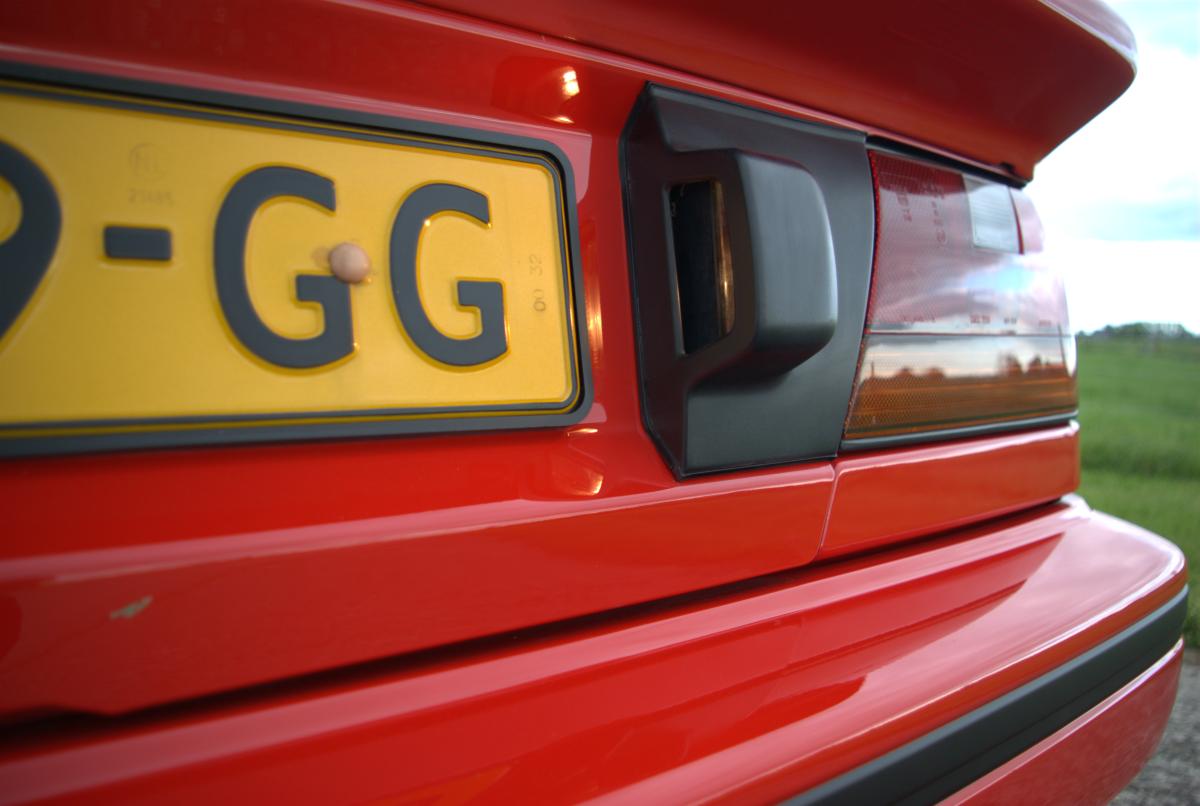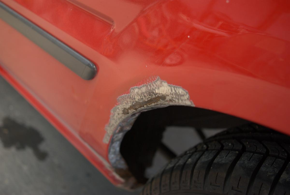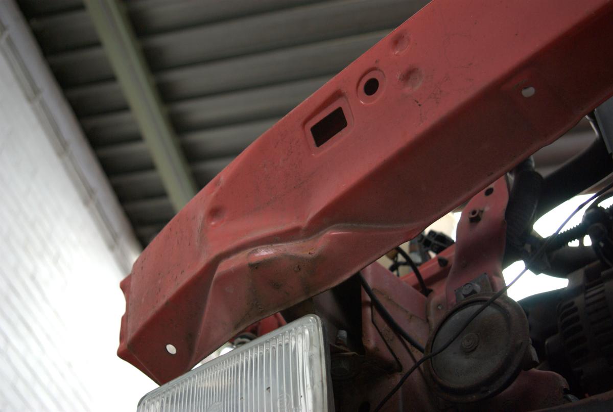 De dorpels waren ook niet supergaaf meer. Bij de achterwielen zat aan weerszijden een gat, en op de aanzetting halverwege de dorpels begon de roestduivel (zij het na 24 jaar pas) te vreten. Naast deze roestproblemen was de lak op plaatsen ook niet mooi meer. De voorbumper is ooit vervangen door een standaardbumper die voorzien is van mistlampgaten en een rood kleurtje. De blanke lak begon af te bladderen en dat ging van kwaad tot erger. De grootste doornen in Carnold’s oog waren de deukjes in de rechter zijkant. Oude parkeerschades die des te meer opvielen omdat ze midden in het strakke plaatwerk zaten.