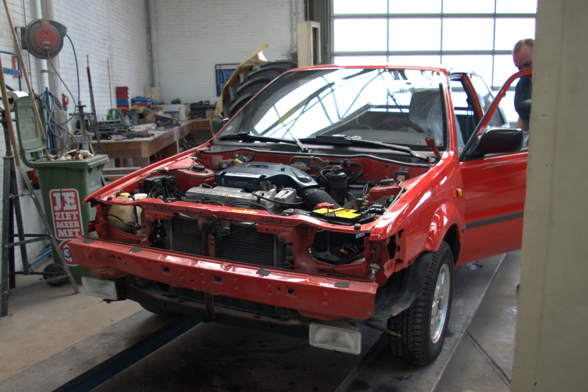 De firma Van Krimpen kwam met een goed plan van aanpak, en zo geschiedde het dat de Sunny fris gewassen bij de autoschadehersteller geparkeerd werd. Ik heb de werkzaamheden op de gevoelige chip vastgelegd: