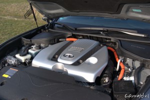 Laten we de constructie eens onder de technische loep nemen. De benzinemotor is Nissan’s VQ35HR die een dikke 300 pk levert, deze is via een droge koppeling aan een 67 pk sterke elektromotor gekoppeld. Deze elektromotor draait altijd met de prise-as (ingaande as) van de automaat mee. feitelijk vervangt de elektromotor de koppelomvormer, want de elektromotor heeft genoeg koppel om de aandrijving vanuit stilstand te verzorgen. Komt het toerental van de prise-as in het werkbereik van de benzinemotor, dan grijpt de droge koppeling aan en kan de benzinemotor (een deel van) de aandrijving op zich nemen. Wat de Infiniti Hybrid bijzonder maakt, is een tweede koppeling die tussen de versnellingsbak en de cardanas gemonteerd is. Deze natte koppeling is ontworpen om gecontroleerd te slippen en zorgt ervoor dat de samenwerking tussen elektromotor en benzinemotor zo vloeiend verloopt.