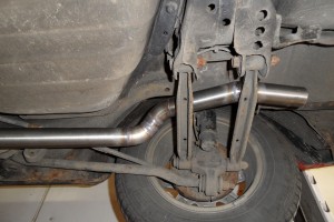 Uitlaat rond achterwielophanging
